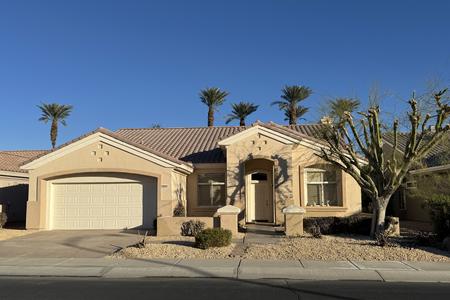 Amazing opportunity in Sun City Palm Desert! One of the best values on a premium lot with awesome golf course and mountain views. This beautiful 2 bedroom plus den, 2 bathroom home is perfectly positioned to take in the stunning views from the spacious covered back patio - ideal for morning coffee or evening sunsets and room for a pool. Step inside to a light-filled, Casablanca floor plan with high ceilings and thoughtful design throughout. The kitchen features a sit-up bar, ample storage and a breakfast nook which flow into the family room with cozy fireplace and built-in shelving. The flexible den/office space offers additional functionality and can be easily made into a 3rd bedroom. Enjoy a second private outdoor space with a charming enclosed front courtyard - perfect for relaxing or greeting neighbors. The home also includes a 2 car extended garage for larger vehicles or extra storage. Come experience the best of desert living with golf, pools, tennis, pickleball, fitness centers, dining and endless social activities - all within a welcoming community.